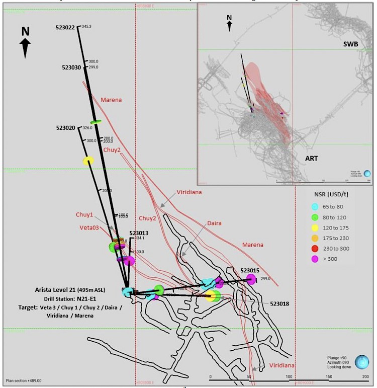 Infill and step-out drilling from Level 21 drill stations in the Arista vein system successfully intercepted a series of closely spaced veins down-dip below and along strike to the north-west of the existing Arista mine workings. Infill drilling results during this period along the north-west extension of the Arista vein system continues to show structural continuity (along strike and at depth) and economic potential within these veins beyond areas previously modelled and outside the current resource shell. Of important note, 1) the presence of accessible high-grade gold mineralization immediately below the current productive Level 21 of the Arista mine, and 2) evidence of the robust vertical nature of the Arista epithermal vein system with the continuation of high-grade precious metals at depth. Select highlights from year-to-date 2023 holes in the north-west Arista vein system include: